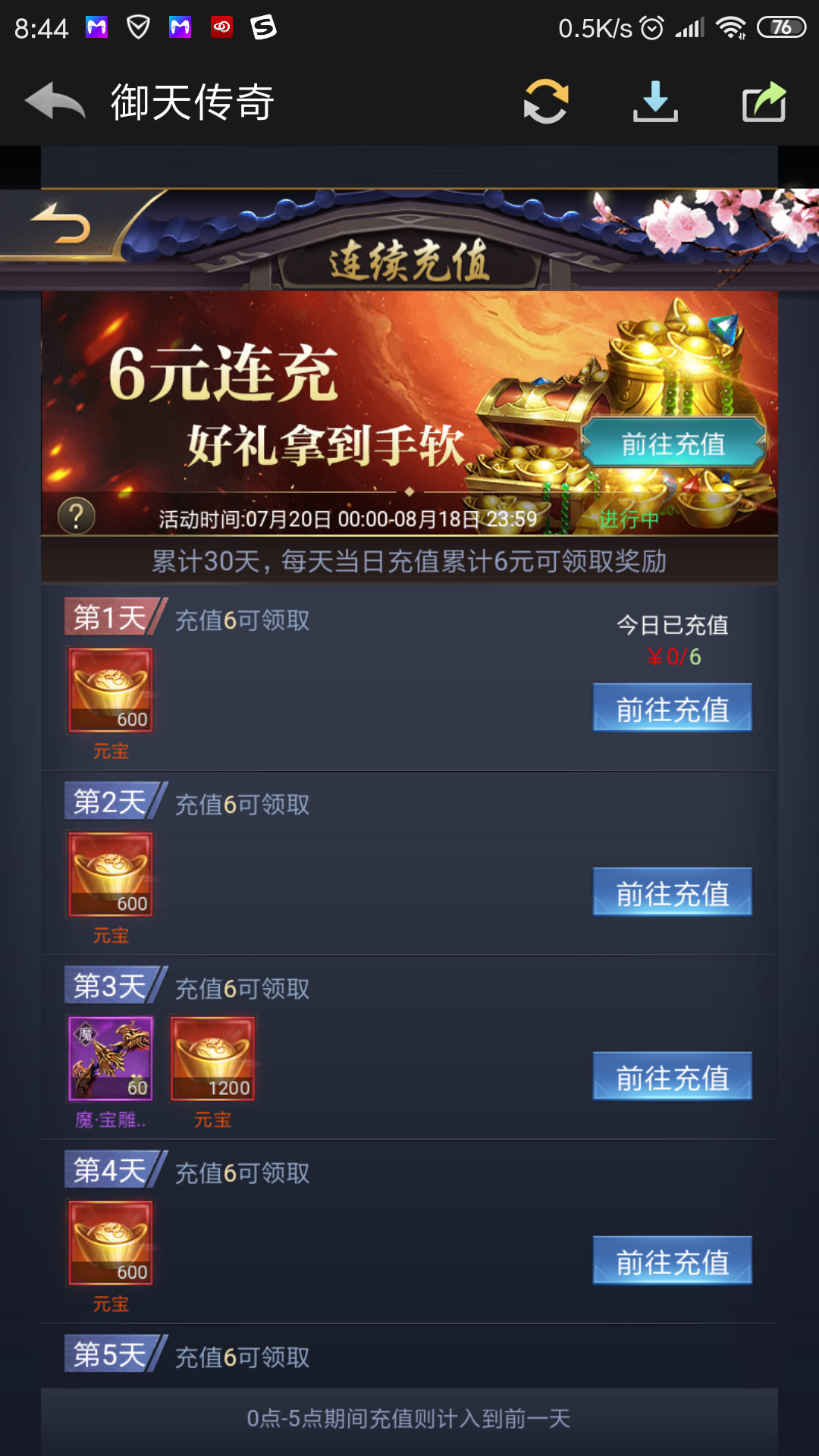 昨天御天传奇合服后为什么6元连充活动要重头开始,我已经连充了21天了。